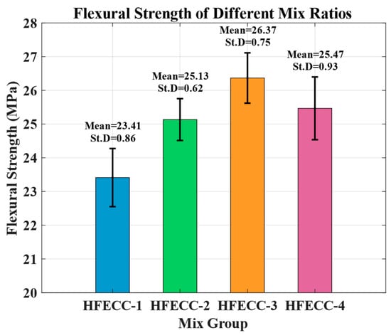 Figure 9 presents the results of the three-point flexural strength test of HFECC under the four mix ratios. It could be observed that, as the PE fiber content gradually decreased and the BFRP fiber content gradually increased, the flexural strength of the specimens first increased and then decreased. The highest flexural strength of 26.36 MPa was achieved by the HFECC-3 specimen. Regarding fiber content, in the range from HFECC-1 to HFECC-4, the PE fiber content decreased from 1.40 vol.% to 1.25 vol.%, while the BFRP fiber content increased from 0.20 vol.% to 0.35 vol.%. In the case of HFECC-3, the PE fiber content was 1.30 vol.% and BFRP fiber content was 0.30 vol.%, which resulted in the most significant synergistic effect between the two fibers, showing the best enhancement effect. This was mainly because the PE fibers had excellent ductility and bridging ability, effectively inhibiting the expansion of microcracks and improving material toughness. On the other hand, the BFRP fibers had higher stiffness and strength. These properties could enhance the load-bearing capacity of the components. When the fiber ratio was optimal, the two fibers formed a good synergistic enhancement effect, balancing both toughness and strength and significantly improving the flexural strength. However, when the BFRP fiber content increased further (as in HFECC-4), although the ability to enhance stiffness was improved, the reduction in PE fiber content led to a decrease in toughness. Additionally, there could have been uneven distribution or aggregation of BFRP fibers, resulting in stress concentration and a slight decrease in flexural strength. After the test, the specimens of each group were observed and analyzed based on the failure modes shown in Figure 10. Overall, all of the specimens exhibited typical three-point bending failure. The cracks were mostly located near the center of the loading points, with relatively regular crack propagation paths, and no severe brittle fracture was observed. This indicated that the incorporation of fibers had a good inhibitory effect on crack propagation. Specifically, the HFECC-1 and HFECC-2 groups had larger crack widths due to the lower BFRP fiber content, suggesting that their load-bearing and crack resistance performance had not reached the optimal state. The HFECC-3 group not only showed the highest flexural strength, but also exhibited finer and more evenly distributed cracks with a more ductile failure mode, demonstrating good energy dissipation ability. The HFECC-4 group, although having a higher BFRP fiber content, showed more localized cracks and some brittle behavior, possibly due to fiber aggregation, leading to uneven distribution [45].