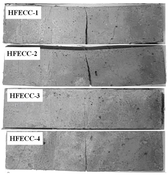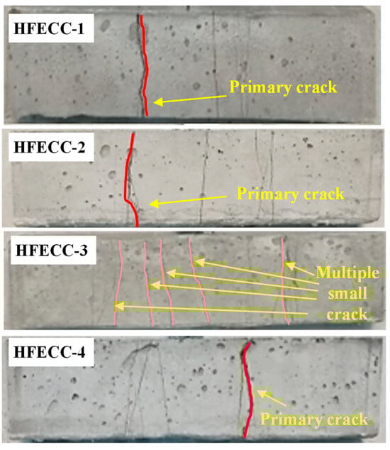 Figure 12 presents the typical bending failure morphology of the four groups of specimens. It can be observed that the specimens of HFECC-1, HFECC-2, and HFECC-4 developed primary cracks earlier under load, exhibiting a certain degree of brittle failure. In contrast, the HFECC-3 specimens showed a more uniform crack distribution and greater deformation capacity during bending failure, with multiple small cracks forming, indicating ductile behavior [37]. This phenomenon further verified the consistency between the equivalent bending toughness results and the failure morphology.
