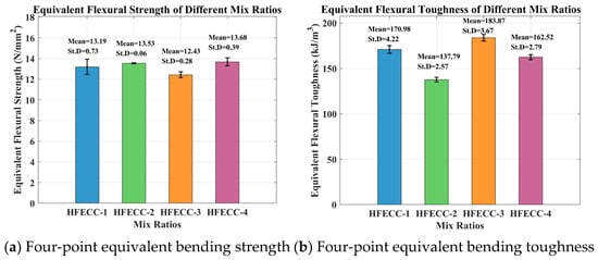 The equivalent bending strength and toughness of specimens with different fiber composite ratios are shown in Figure 11. In terms of equivalent bending strength, the values of the four groups fluctuated slightly, with the average ranging from 12.43 to 13.68 N/mm2. The HFECC-4 group exhibited the highest equivalent bending strength (13.68 N/mm2), followed by HFECC-2 (13.53 N/mm2), and the lowest was HFECC-3 (12.43 N/mm2). This suggests that, with the increase in BFRP fiber content, its higher modulus and rigidity enhanced the initial load-bearing capacity of the specimens to a certain extent. Particularly in HFECC-4, with a BFRP fiber content of 0.35 vol.%, the enhancement effect was more pronounced. In contrast, the PE fibers mainly contributed to ductility, with a weaker direct enhancement effect on strength. Therefore, although HFECC-3 had a higher PE fiber content, its equivalent bending strength was slightly lower. However, the results of equivalent bending toughness showed significant differences between the different ratios. The equivalent bending toughness of HFECC-3 reached 183.87 kJ/m3, the highest among the four groups, approximately 33.4% higher than that of HFECC-2 (137.79 kJ/m3), indicating better energy absorption ability and fracture ductility. The equivalent bending toughness of HFECC-1 and HFECC-4 was at an intermediate level, at 170.98 kJ/m3 and 162.52 kJ/m3, respectively. Based on the ratio analysis, in HFECC-3, the PE and BFRP fiber contents were 1.30 vol.% and 0.30 vol.%, respectively. This combination optimally balanced crack control and fiber bridging and energy dissipation mechanisms, significantly improving the material’s equivalent bending toughness.