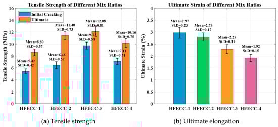 Figure 13 shows the initial crack tensile strength, ultimate tensile strength, and ultimate elongation of the specimens with different mix ratios. In terms of initial crack tensile strength, with the increase in BFRP fiber content in the mix ratio, the initial crack strength showed an increasing trend. Specifically, HFECC-3 reached the highest value of 9.728 MPa, significantly higher than the other groups. HFECC-2 and HFECC-4 had values of 6.46 MPa and 7.11 MPa, respectively, while HFECC-1 had the lowest at 5.42 MPa. This suggests that the inclusion of BFRP fibers effectively improved the material’s crack resistance. The high elastic modulus and strong interfacial bonding properties of BFRP fibers helped suppress cracks before microcracks formed, thereby increasing the initial crack stress level. Regarding ultimate tensile strength, HFECC-3 was still the highest among the four groups, reaching 12.08 MPa. HFECC-2 followed at 11.4 MPa, while HFECC-1 and HFECC-4 had values of 8.6 MPa and 10.16 MPa, respectively. This trend indicates that BFRP fibers are effective in enhancing post-crack load-bearing capacity, particularly in HFECC-3, where the BFRP fibers (0.30 vol.%) and PE fibers (1.30 vol.%) form an optimal synergy, ensuring sustained tensile force in the post-crack phase and delaying the final failure of the material. This trend was similar to the findings of Dias and Thaumaturgo [23]. According to their research, BFRP-fiber-reinforced cement-based materials primarily experience fiber pull-out failure under tension, and the fiber pull-out improves the material’s performance after cracking. Branston et al. [24] also found that basalt-fiber-reinforced concrete improved pre-crack strength, and the fiber pull-out mechanism further enhanced post-crack performance.