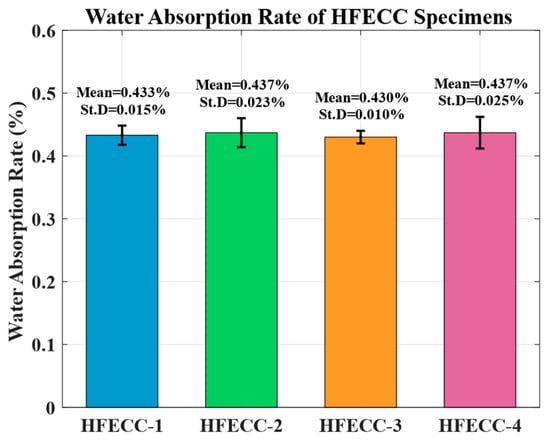 Figure 14 presents the water absorption results of the four groups of HFECC specimens. The absorption values are relatively close, measured at 0.430% (HFECC-3), 0.433% (HFECC-1), and 0.437% (HFECC-2 and HFECC-4), with standard deviations ranging from 0.015% to 0.025%. This indicates good consistency and stability in the water absorption performance across different HFECC mix designs, with minimal variability among specimens. The similarity in water absorption can be attributed to the comparable pore structure characteristics of the specimens. All HFECC mixtures incorporated a certain volume fraction of basalt-fiber-reinforced polymer (BFRP), which plays a bridging and filling role during the hardening process [47]. This helps to control microcrack propagation and reduce pore connectivity, thereby limiting water migration paths. Moreover, all groups included a relatively high dosage of mineral admixtures (such as fly ash), which contributed to the formation of additional calcium silicate hydrate (C–S–H) gel through continued hydration, enhancing matrix densification [48]. Therefore, despite slight variations in fiber content or matrix composition, their influence on water absorption was minimal, and the overall resistance to water ingress remained consistently high across all groups.