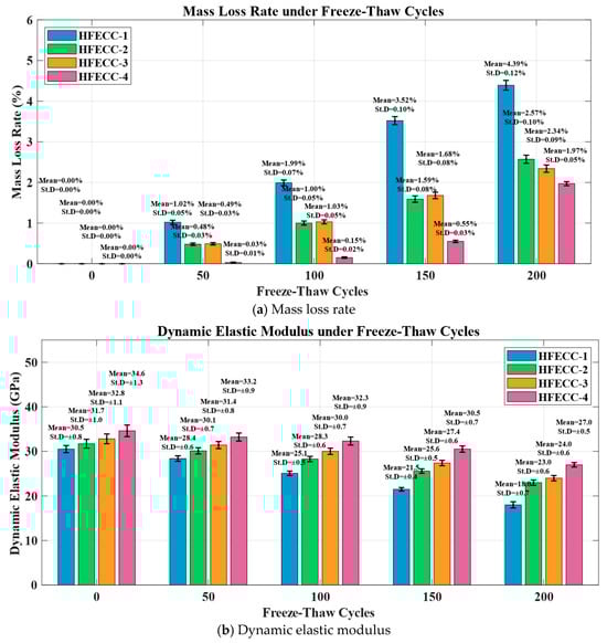 Figure 15a shows the mass loss rate of specimens under different mix ratios with the increase in freeze–thaw cycles. It can be seen that, from 0 to 200 freeze–thaw cycles, the mass of all groups decreased to different extents, and the mass loss rate increased as the number of freeze–thaw cycles progressed. After 50 freeze–thaw cycles, the mass loss rate of HFECC-1 was 1.02%, significantly higher than that of HFECC-2 (0.48%), HFECC-3 (0.49%), and HFECC-4 (0.03%). As the number of freeze–thaw cycles increased to 100, 150, and 200, this trend remained evident. After 200 freeze–thaw cycles, the mass loss rate of HFECC-1 increased to 4.39%, nearly 2.2 times that of HFECC-4 (1.97%), indicating the poorest freeze–thaw performance. On the other hand, HFECC-4 consistently exhibited the lowest mass loss rate, with the most gradual increase throughout the entire freeze–thaw process, demonstrating the best freeze–thaw durability. Further observation of the freeze–thaw stability of the four groups revealed that the mass loss rates of HFECC-2 and HFECC-3 were very close throughout the entire testing period. The maximum difference did not exceed 0.23%. This indicates that both mixes, with BFRP fiber contents of 0.25 vol.% and 0.30 vol.%, respectively, exhibited good freeze–thaw resistance. In contrast, the BFRP fiber content in HFECC-1 was only 0.20 vol.%, and its freeze–thaw resistance was significantly reduced, while HFECC-4, with a BFRP fiber content of 0.35 vol.%, demonstrated the best performance among all mixes. It should be noted that HFECC-4 had the lowest ultimate elongation (1.92%) among the four groups, which may limit its application in structures requiring high ductility. In contrast, HFECC-3 achieved a more favorable balance between ductility and environmental resistance. With an ultimate elongation of 2.29% and a mass loss rate of only 2.08% after 200 freeze–thaw cycles, HFECC-3 demonstrated both satisfactory freeze–thaw durability and relatively high deformation capacity. This suggests that HFECC-3 offers a well-balanced fiber hybridization strategy, making it more suitable for structural applications where both mechanical flexibility and environmental durability are critical.