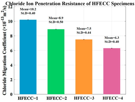 The chloride ion migration coefficients DRCM of the four groups of HFECC specimens are shown in Figure 16. The results indicate that the migration coefficients of all specimens fall within the RCM-IV grade range, demonstrating good resistance to chloride ion penetration. Overall, as the BFRP fiber content increases, the chloride ion migration coefficient gradually decreases, indicating an improvement in impermeability. Among the specimens, the migration coefficient of HFECC-1 was 10.2 × 10−13 m2/s, the highest among the four groups. In contrast, HFECC-4 had the lowest migration coefficient of 6.3 × 10−13 m2/s, showing the best resistance to chloride ion penetration. This trend suggests that the incorporation of BFRP fibers significantly improves the density of the cement-based composites. BFRP fibers effectively block the migration path of chloride ions and reduce their diffusion rate. According to the studies conducted by Liu [29], BFRP fibers could create a three-dimensional network structure through physical obstruction, significantly increasing the tortuosity of chloride ion migration paths and reducing their diffusion rate by elongating the transport trajectory. As demonstrated by Wang et al. [28], the BFRP fibers could effectively inhibit microcrack propagation, thereby minimizing interconnected permeation channels. This mechanism restricts chloride penetration depth. These findings indicate that a suitable amount of BFRP fibers can effectively enhance the microstructure of cement-based composites, improving their resistance to chloride ion penetration and thus increasing the material’s service durability in chloride-containing environments. The excellent performance of HFECC-4 further validates the potential application of BFRP fibers in enhancing material durability.