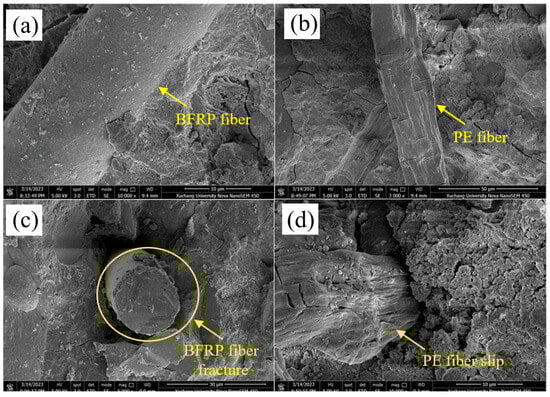 To further investigate the synergistic toughening mechanism of PE fibers and BFRP fibers in the HFECC-3 composite, SEM observations [49,50] were conducted on the fracture surfaces of specimens after the four-point bending test, as shown in Figure 17. Figure 17a shows that the BFRP fibers are evenly distributed in the cement matrix, with strong interface bonding. The good dispersion of BFRP fibers is attributed to their inorganic nature and density, which are similar to those of the cement matrix, thus helping to prevent interface delamination during the molding process and enhancing the bonding strength and collaborative load-bearing capacity in the interface region. Figure 17b displays the surface microstructure of the PE fibers under load. Compared to BFRP fibers, the surface of PE fibers is rougher, with more micropores in the interface transition zone, and their cross-section presents an irregular shape, exhibiting typical plastic deformation characteristics. This phenomenon indicates that the PE fibers undergo significant slip and frictional energy dissipation during loading, with surface twisting and scratches revealing their important role in stress transfer and crack propagation control, effectively improving the overall toughness of the material [13]. Figure 17c shows the fracture morphology of the BFRP fibers. Compared to Figure 17b, the difference in failure modes between the two types of fibers is more apparent. BFRP fibers primarily exhibit brittle fracture, with smooth fracture surfaces, indicating rapid failure after reaching ultimate strength. In contrast, PE fibers predominantly fail by pull-out, with distinct shear marks and plastic deformation traces on the fiber surface, leaving pull-out marks in the matrix. This difference in failure behavior demonstrates that the PE fibers can continuously dissipate energy through the pull-out process during the crack propagation stage, enhancing the material’s ductile response. Figure 17d reveals the synergistic toughening mechanism of the composite fibers. Due to the strong hydrophobicity of the PE fibers, the interface bond strength with the matrix is relatively weak, which leads to pull-out behavior during loading. This provides a certain degree of ductile buffering effect during the initial crack initiation and propagation stages. On the other hand, BFRP fibers can maintain an effective bridging state at higher stress levels, delaying further crack propagation. The two fibers work synergistically at different stress stages, forming a multi-stage energy dissipation mechanism that gradually interrupts crack propagation, effectively improving the mechanical strength and toughness of the material.