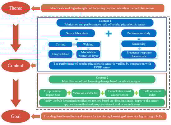 This paper designs a bonded piezoelectric sensor based on PMN-PT piezoelectric single crystal through a research method that combines theoretical analysis, experimental exploration and simulation, and conducts bolt loosening damage identification experiments and simulations based on PMN-PT sensors. An improved scheme for piezoelectric smart washer sensors is proposed, and bolt loosening damage identification indicators are established. The structural framework of this paper is shown in Figure 1.
