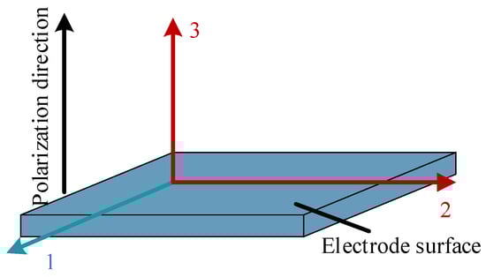 In the formula, Cλu, djλ, and μij are the sensor’s flexibility coefficient, piezoelectric strain constant, and dielectric constant, respectively. The piezoelectric strain constant describes the intrinsic relationship between external mechanical stress and charge displacement. It is often used to calculate key indicators such as the material’s charge output, voltage output, and charge sensitivity. The i and j in the subscripts represent the polarization direction of the piezoelectric material and the direction of the external mechanical stress, respectively [35]. Figure 2 shows the coordinate system of the piezoelectric material with a polarization direction of 3, with the x-axis, y-axis, and z-axis directions marked as 1, 2, and 3, respectively. According to the piezoelectric material’s different external forces and deformation directions, the piezoelectric constant can be represented by d31, d32, and d33. For example, the longitudinal piezoelectric coefficient d33 represents the strain response coefficient of the piezoelectric material in the polarization direction. In addition, the dielectric constant, also known as the relative dielectric constant, reflects the proportional relationship between the internal polarization intensity and the external electric field intensity of the piezoelectric material when subjected to an external electric field. The dielectric constant reflects the piezoelectric material’s ability to respond to electric fields and substantially impacts the piezoelectric element’s operating frequency range.