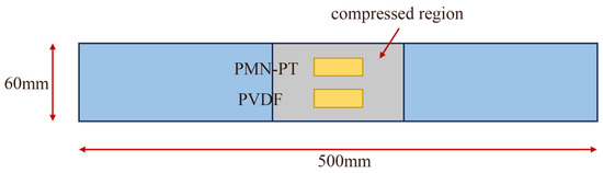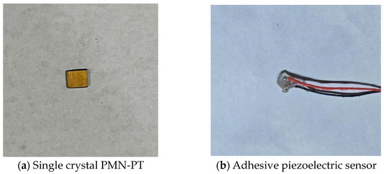 To ensure that the homemade PMN-PT sensor can accurately respond to changes in structural stress and that reliable measurement results can be obtained in practical applications, a sensitivity test on the homemade PMN-PT piezoelectric sensor is necessary. Sensitivity refers to the ratio of the change in the sensor output voltage to the corresponding stress change, which can measure the sensor’s ability to respond to applied stress. The experiment selected the main materials of 500 × 60 × 8 mm Q345 high-performance steel plate, PMN-PT sensor, and PVDF sensor. The piezoelectric sensitive element of the PMN-PT sensor is the relaxor ferroelectric single crystal PMN-PT, which is cut into 5 × 5 × 0.5 mm, as shown in Figure 3a. The processed PMN-PT single crystal is welded to the wire. Then, the epoxy resin AB glue is modulated according to the volume ratio of A:B = 2.5:1, and then it is used to encapsulate the sensor to increase the stability of the wire connection and the waterproofness of the sensor. Then, it is placed in a cool and dry place for more than 24 h before demolding. The prepared sensor is shown in Figure 3b. Some performance parameters of the two sensors and their installation diagrams are shown in Table 1 and Figure 4.