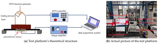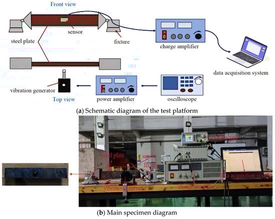 The construction of the test platform is shown in Figure 5. The loading device uses an E45.695 electronic universal testing machine to apply cyclic loads to the steel plate. The load command is controlled by the MTS function. The load signal is collected and stored in the computer through the sensor in the pressure head of the testing machine. The sensor signal is amplified by the charge amplifier and input into the data acquisition system for collection. Figure 5a,b shows the test platform’s theoretical structures and actual picture of the test platform.