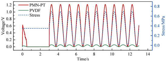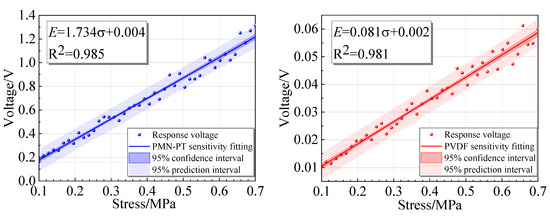 The sensitivity of the two sensors is further calculated. According to the definition of the sensitivity of the piezoelectric sensor as the ratio of the change in the output voltage to the change in the stress value, the voltage generated by the two sensors is linearly fitted with the stress signal at the corresponding time. The slope of the straight line is the sensor sensitivity. The fitting result is shown in Figure 7. The sensitivity of the PMN-PT piezoelectric sensor is 1.734 V/MPa, and the linear fitting R2 is 0.985; the sensitivity of the PVDF piezoelectric sensor is 0.081 V/MPa, and R2 is 0.981. It can be seen that the sensitivity of PMN-PT is much higher than that of PVDF, and the response effect to stress is better.