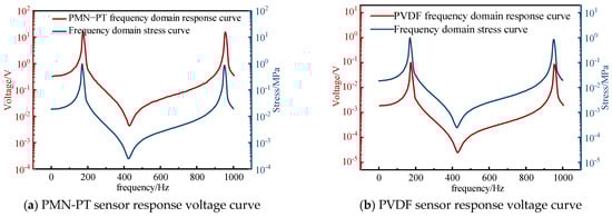 The following test was also carried out using the device described in Section 3.1. Considering that the monitoring frequency range of the bridge structure is usually within 1000 Hz, the frequency range of the swept frequency signal used in the test is 0–1000 Hz. Before the test, the steel plate component was preloaded with 0.5 kN for 3 s; then, the formal loading began, applying a swept frequency sine wave load with an amplitude of 0.5 kN for 10 s. The voltage response signals generated by the two sensors were collected using DH-5922 N and then converted into frequency domain signals through Fourier transform, as shown in Figure 8. The test results show that the voltage response curve of the piezoelectric sensor is consistent with the changing trend of the structural stress curve, indicating that the piezoelectric sensor can respond well to the changes in internal stress of the structure. At the same time, the response voltage of the PMN-PT sensor is much higher than the response voltage of the PVDF sensor, proving that the PMN-PT sensor has a better response effect on stress.