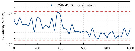 In structural health monitoring, the sensor will be subjected to loads of different frequencies. At this time, the stability of the sensor sensitivity is particularly important. This paper fits the frequency sweep results of the structural stress amplitude and the sensor output voltage amplitude to obtain the piezoelectric sensor’s sensitivity curve in the frequency domain, as shown in Figure 9.