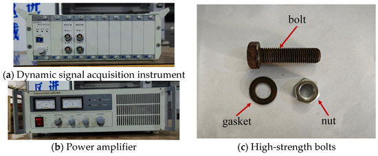 The test uses the dynamic signal acquisition instrument DH-5922N to accurately measure the signal generated by the sensor, as shown in Figure 10a; the SA-PA010 power amplifier is selected to drive the exciter as a high-power vibration source for vibration testing and vibration measurement, as shown in Figure 10b; the bolts are M16 large hexagonal high-strength bolts with a nominal diameter of 16 mm and a length of 60 mm, as shown in Figure 10c.
