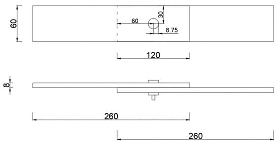 This test is based on the actual material selection of steel structure bridges. Q345 steel plates are selected and matched with M16-grade large hexagonal high-strength bolts. According to the requirements of the “Code for design, construction, and acceptance of high strength bolting for steel structure” (JGJ82-2011) [36], the diameter of the M16 bolt is 16 mm, the allowable deviation is ±0.43 mm, the diameter of the bolt hole is 17.5 mm, and the allowable deviation is +0.43 mm. The distance from the center of the bolt hole to the edge of the component is a maximum of 4 times the bolt hole diameter and a minimum of 1.5 times the bolt hole diameter. The specimen parameters are shown in Figure 11.