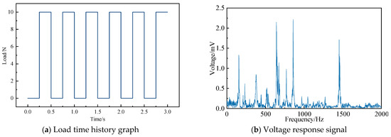 According to the test platform schematic diagram, connect the vibration test-related instruments, including sensors, acquisition instruments, charge amplifiers, etc., as shown in Figure 12b, and use a wrench to apply bolt preload to the structure. After the sensor signal is stable, use the exciter to apply continuous low-frequency excitation to the structure, collect the response voltage of the PMN-PT sensor, and record the corresponding bolt preload; use a torque wrench to continuously increase the preload, and repeat the previous experimental steps until the preload is loaded to 10,000 N; in the test, the exciter applies a square wave load with an excitation amplitude of 10 N and a frequency of 2 Hz, and its time history curve is shown in Figure 13a. Use the Donghua DHDAS dynamic acquisition system to collect the sensor’s response voltage signal, perform a fast Fourier transform on the voltage signal, and output the signal as a frequency domain signal, as shown in Figure 13b. Analysis of the frequency domain diagram shows that the frequency corresponding to the spectrum diagram’s peak voltage is the structure’s natural frequency. This method can determine the structure’s natural frequency under different bolt preloads.