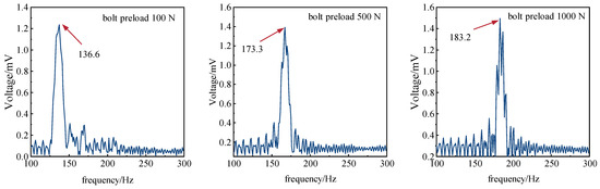 Due to the many test conditions, the spectrum diagram at the 1st order peak when the bolt preload is 100 N, 500 N, and 1000 N is extracted, as shown in Figure 14. Analysis shows that the 1st order peak of the spectrum diagram appears between 100 Hz and 300 Hz and gradually shifts to the right as the bolt preload increases, and the amplitude of the corresponding response voltage also increases accordingly.