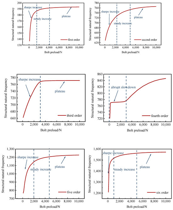 In the test, the bolt preload was changed from 0 to 10,000 N, and the structure’s 1st, 2nd, and 3rd order natural frequencies were extracted, as shown in Table 4.