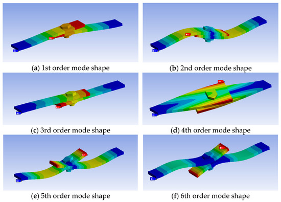 The simulation using ANSYS Workbench is conducted to calculate the natural frequency values of the structure under different bolt preload conditions and to compare these results with the experimental findings discussed earlier. After completing the model calculations, due to the numerous mode shapes, and the fact that this section does not focus on a detailed analysis of the mode shapes, we extract the first six mode shapes under one specific preload, as shown in Figure 17. From the figure, it can be seen that the 3rd and 4th order mode shapes exhibit tangential deformations, while the other four modes show normal deformations.