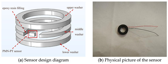 The adhesive sensor is located on the structure’s surface, is easily damaged, and cannot be reused after being pasted. Therefore, to make up for the shortcomings of the adhesive sensor and ensure the integrity of the bolt structure itself, this paper proposes to embed a homemade PMN-PT piezoelectric sensor in the bolt’s auxiliary component washer to make an intelligent washer sensor. The design diagram is shown in Figure 18a. The production process is as follows: insert an open washer between two complete washers and overlap them together, place the sensor at the opening position of the middle layer washer, fill the gap with epoxy resin, and then use superglue to bond the three washers into a whole. The actual picture of the piezoelectric intelligent washer sensor is shown in Figure 18b.