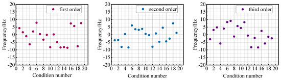By subtracting and comparing the test data of this test with the test data measured in Section 4.1.2, the error distribution of the structural natural frequency is obtained, and the error distribution diagrams of the 1st, 2nd, and 3rd order natural frequencies are plotted as shown in Figure 19.