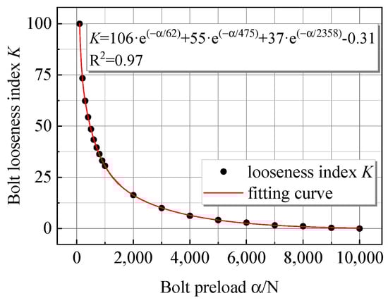 The two are fitted to further explore the correlation between the loose index K and the bolt preload, and the results are shown in Figure 20. From the fitting results, the bolt preload and the loose index satisfy the exponential decay relationship, and the goodness of fit is as high as 0.97, indicating that there is a good correlation between the loose index K and the bolt preload.