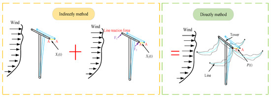 The displacement response component of the tower induced by line support reaction forces is denoted as , and the displacement response component induced by dynamic wind loads acting on the tower itself is denoted as . Their respective extreme values are assumed to be and . During wind tunnel testing, when acquiring the non-Gaussian component , the entire tower was shielded to ensure there was no displacement response under the shielded condition. The line was then installed on the tower, and the measured tower displacement was defined as . For the Gaussian component , only the displacement response measured behind the tower was retained as . The scalar (linear) combined response , expressed through these two random response processes, and , is defined as follows: