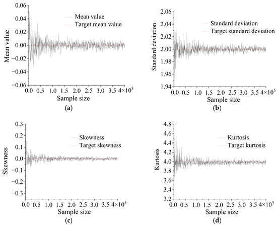 Time history samples are generated under given combinations of mean value, STD, correlation coefficient , , and . As shown in Figure 3a,b, the probability distribution histogram of the non-Gaussian process exhibits a steeper profile compared with the Gaussian distribution, which results from its kurtosis exceeding that of the Gaussian distribution. This observation preliminarily confirms the validity of the generated non-Gaussian process. The probability distribution histogram of the scalar combination of response results is presented in Figure 3c. To determine the optimal sample size for minimizing computational costs and validate the accuracy of generated time history samples, key statistical parameters (mean, STD, , ) derived from Monte Carlo simulations are compared with target values, as illustrated in Figure 4. The sample statistical parameters progressively converge toward target values with increasing sample size, though the convergence rate gradually slows. When the sample size exceeds 2 × 105, the parameters stabilize with no significant variations, and the relative changes in simulated statistics (mean, standard deviation, etc.) remain below 2%, demonstrating the validity of the Monte Carlo method in generating target time history samples. Following Chen et al.’s study [34], a sample size of 2 × 105 was selected by balancing computational costs in numerical simulations.