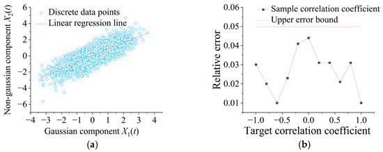 Since the between response components is a key variable parameter, the under the optimal sample size are compared with target values, as shown in Figure 5. Figure 5a displays scatter plots at , demonstrating a clear positive correlation without significant outliers. The slope of the linear regression line obtained via the least squares method is 0.802, closely matching the target . Figure 5b reveals that within the range, the relative error between sample and target values remains within 5%, meeting precision requirements. In conclusion, the Monte Carlo simulation method can effectively generate target time histories.
