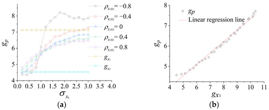 The combined response is obtained by combining non-Gaussian response component and Gaussian response component from the cases in Section 3.2 using Equation (17). The influence of STDs and on the peak factor of is then analyzed. Figure 8a shows the variation curves of under different and . When varies at 0~0.8, increases with , but the growth rate gradually decreases. For cases involving and , initially decreases with the STD of the non-Gaussian component then rapidly increases, stabilizing near = 1.5. Additionally, within the range, peak factor of non-Gaussian response component and peak factor of Gaussian response component remain nearly constant. As shown in Figure 8b, and are approximately linear under certain and . Previous analyses indicate that is predominantly governed by the and of . Therefore, can be modeled as a function of and .