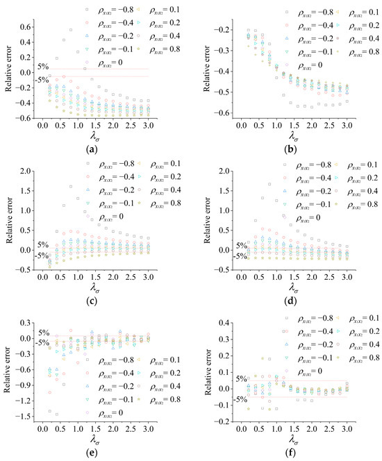 Considering that primarily depends on and , the applicability of the MCQC rule and other combination rules (e.g., SRSS, CQC, TR, 40%, and 75%) are systematically evaluated from the perspectives of and . This study specifically focuses on extreme-value combinations of non-Gaussian and Gaussian time history. For the non-Gaussian wind load response component, , , , and , respectively. For the Gaussian-distributed wind load response component, these parameters are , , , and , respectively. The between response components is defined over the range −0.8~0.8. The Monte Carlo simulation method is employed to generate random component values under the specified conditions. For each case, 200 time history samples with a duration T = 2000 s and time interval dt = 0.01 s are generated to ensure sufficient sample size for extreme-value estimation. The maximum value of each response group is extracted, and the mean value of the 200 groups is calculated as the true value for each case. Figure 9 illustrates the relative errors between the combined extreme responses of the tower–line system calculated by different combination rules and the true value across varying and , where the red dashed line represents the ±5% error threshold.