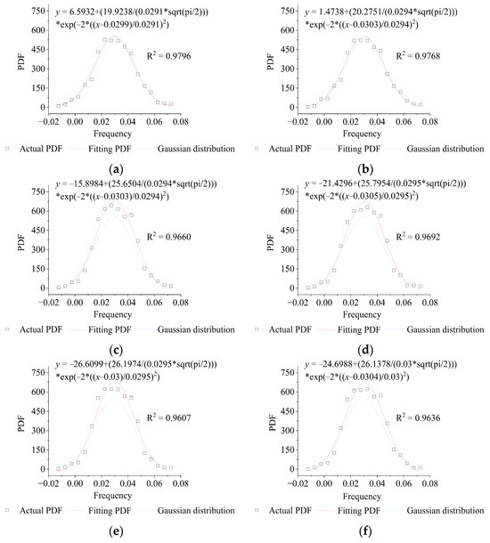 Probability distribution of wind–vibration displacement response. (a) Measuring point T1 under Case 1. (b) Measuring point T2 under Case 1. (c) Measuring point T1 under Case 2. (d) Measuring point T1 under Case 2. (e) Measuring point T1 under Case 3. (f) Measuring point T2 under Case 3.