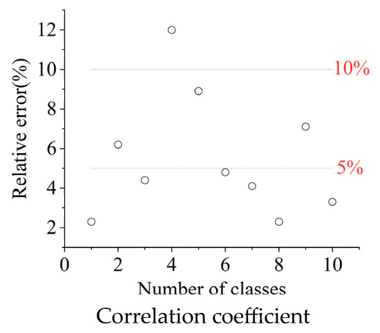 This study focuses on the extreme along-wind displacement responses. Based on 10 sets of wind-induced displacement data from measurement point T1 in Cases 1 and 2, the and STDs are obtained as shown in Figure 12. The extreme-value combination coefficient A = 0.83 is calculated using Equation (22). The relative errors between the calculated extreme displacement responses (using this coefficient) and experimental values from Case 3 are shown in Figure 13. Only one dataset exhibits an error exceeding 10%, while most calculated values show relative errors within 5% compared to experimental data, demonstrating strong consistency and validating the accuracy of the extreme-value combination coefficient for the tower–line system. Furthermore, other combination rules are applied to calculate the extreme wind-induced displacements at measurement point T1 of the tower–line system. The relative errors of different combination rules are summarized in Table 5, confirming that the MCQC rule achieves significantly higher accuracy in estimating extreme wind-induced responses for the tower–line system.