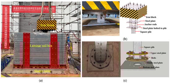 Photographs of shake table test setup. (a) Global view. (b) Pile top–superstructure connection (connection between pile and upper structure). (c) Pile tip–base connection(connection between pile and table base).