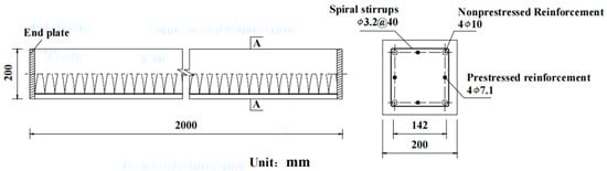 Guided by these similarity principles and equivalence criteria for flexural capacity and shear capacity [27], the model pile was designed with a 200 mm × 200 mm cross-section and a 29 mm concrete cover. The concrete retained the prototype’s C70 strength. As shown in Figure 2, the prestressed reinforcement consisted of four steel rods with a diameter of 7.1 mm. While the non-prestressed reinforcement included four hot-rolled steel bars with a diameter of 10 mm, spiral stirrups were fabricated from 3.2 mm galvanized iron wire spaced at 40 mm intervals.
