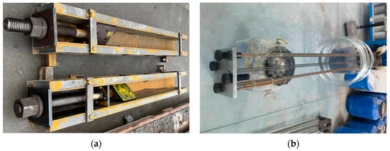 The experiment employed a three-directional six-degree-of-freedom shaking table with a total payload capacity of 20 tons, coupled with a bidirectional laminar shear soil container. To investigate the seismic response of composite reinforcement concrete square piles in soft clay foundations, a single model pile was tested on a shake table. A laminated shear box was used as the model boundary, with the soil container bolted to the table surface, as shown in Figure 1a. The container measured 2.0 m (length) × 1.9 m (width) × 1.85 m (height). To simulate the inertial forces generated by the superstructure, a single mass block (6 tons, designed within the shaking table’s payload constraints) was fixed to the pile top via anchor rods, as shown in Figure 1b. To avoid the failure of the pile-bearing capacity, the pile tip was fixed to the container base, as shown in Figure 1c.
