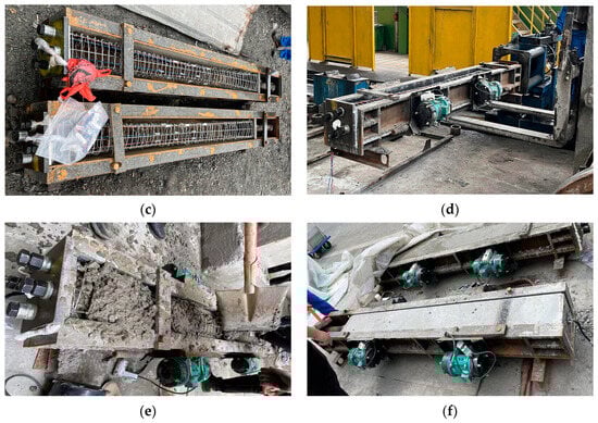 The composite reinforcement concrete square model pile fabrication process: (a) mold; (b) steel cage; (c) cage installation; (d) prestress tensioning; (e) concrete pouring; and (f) curing and demolding.