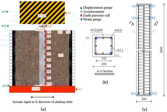 Sensors were arranged along the X and Y centerlines of the test setup, including accelerometers, displacement transducers, earth pressure cells, and strain gauges, as illustrated in Figure 4. Accelerometers (A1–A3 and YA1–YA3) were positioned at three critical locations: the superstructure, pile top, and container base. Additional accelerometers (A4 and A6) monitored the soil surface, while A5 was embedded at mid-soil depth. Three displacement transducers (D1–D3) monitored movement at the superstructure centroid, pile top, and container base. Ten earth pressure sensors (P1–P10) were uniformly distributed along the pile–soil interface on one side of the pile, spaced vertically at 200 mm intervals. For strain monitoring, 22 strain gauges (S1–S22) were affixed to longitudinal rebars on the pile’s outer periphery. These gauges were grouped in pairs at 11 cross-sections, spaced 200 mm apart vertically, enabling deformation measurements across critical pile segments (Figure 4b,c).