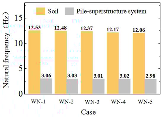 Figure 7 shows the changes in the natural frequencies of the pile–superstructure system and the foundation soil under white noise excitation. Within the seismic intensity of 0.1 g, the natural frequencies of the pile–superstructure system and soil exhibited no significant attenuation after multiple test cases.