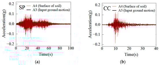 Figure 8 compares the acceleration time histories of the soil surface (A4) and shaking table base (A3) under 0° horizontal SP and CC excitation at 0.1 g PGA. While the waveform exhibited similar shapes, the soil surface experienced significant acceleration amplification relative to the base input. Quantitatively, the peak ground acceleration (PGA) amplification factors reached 1.37 for the SP motion and 1.88 for the CC motion.
