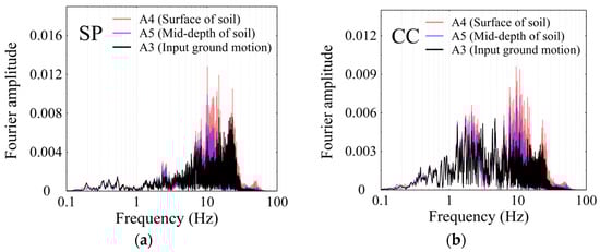 Figure 9 presents the Fourier amplitude spectra at three distinct depths (A4: surface of soil, A5: mid-depth of soil, and A3: shaking table base). The frequency content of the seismic waves underwent significant changes during their propagation toward the ground surface. Notably, frequency components within the 8–15 Hz range exhibited pronounced amplification at the soil surface (A4), closely aligned with the soil’s natural frequency of 12 Hz. This frequency-selective amplification mechanism confirms that soft clay foundations preferentially amplify seismic energy within their resonance band.