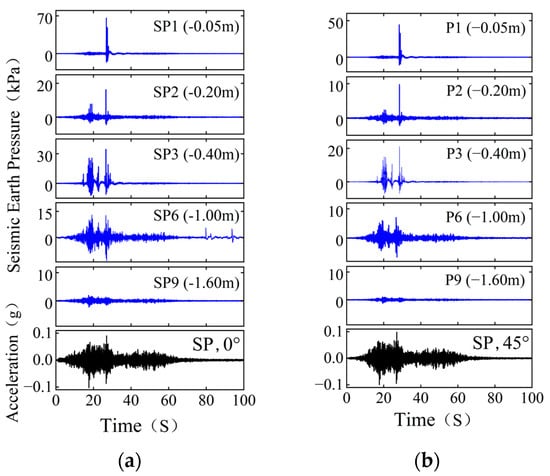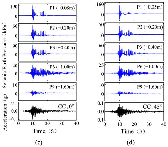 Time history curves of dynamic soil pressure. (a) SP—0°. (b) SP—45°. (c) CC—0°. (d) CC—45°.