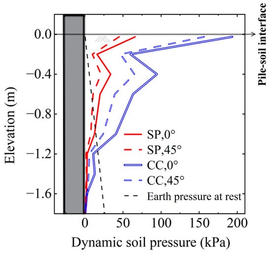 Figure 11 compares the maximum dynamic earth pressure distribution along the pile against the static earth pressure profile [29] (dashed line). The dynamic pressure envelopes exhibited a nonlinear “top-heavy” distribution. Notably, CC excitation induced greater pressures than SP, indicating that the ground motion type significantly affects the pile–soil interface behavior.