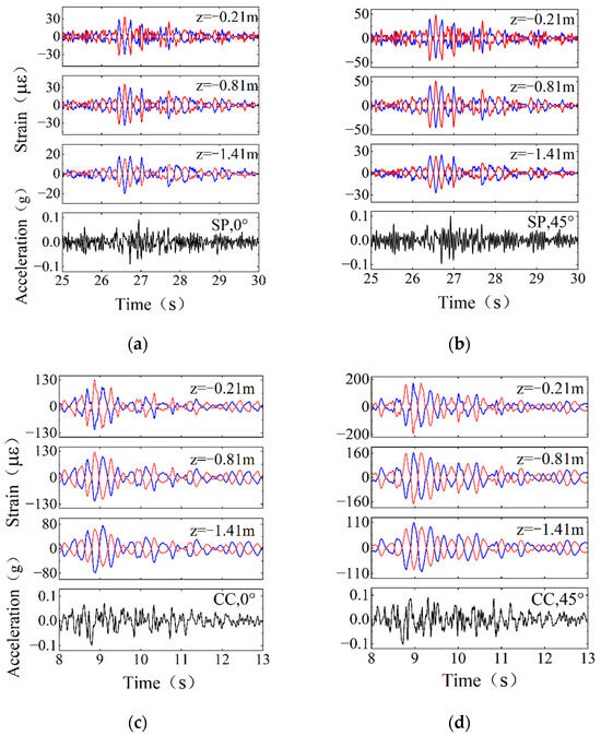 Figure 12 displays the dynamic strain time histories of the outer longitudinal reinforcements at both sides of the pile under 0° and 45° SP and CC ground motions, captured near the peak acceleration phase of the input seismic excitation. As exemplified by the cross-section at −0.21 m elevation, the red and blue curves represent the strain data from gauge S5 and processed data from gauge S6, respectively. The strain profiles at all monitored elevations exhibited comparable amplitudes but opposite phases between opposed reinforcements, indicating that during seismic loading, the pile consistently maintained that one side was in tension and the other in compression due to dynamic bending. This behavior demonstrates that the pile deformation was predominantly flexural under seismic excitation.