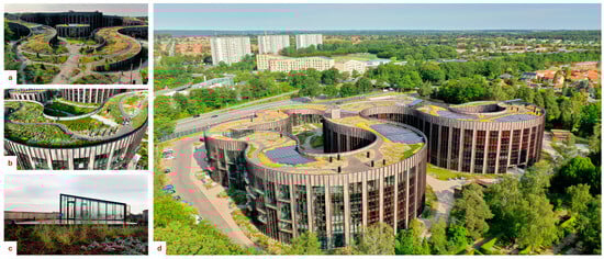 One of the most remarkable examples is the Max Planck Institute for the Structure and Dynamics of Matter, designed by Landschaftsarchitektur+. The 3870 m2 roof is largely green, with a combination of an extensive, multi-layered roof and a roof garden on the terraces and in the dining area. It includes perennials, herbs, and trees, offers relaxation areas and paths with ramps and stairs [33]. This project was awarded the “Green Roof of the Year 2021” prize by the German Green Building Association (BUUG). The green roof of the Max Planck Institute for the Structure and Dynamics of Matter is an innovative project that combines environmental sustainability, human well-being, and social cohesion. Thanks to extensive planting with perennials, trees, and shrubs, it improves biodiversity and helps regulate the microclimate, thereby reducing the building’s energy consumption [31]. Furthermore, the rainwater collection system optimizes the use of water resources and reduces disposal and irrigation costs [34]. In addition to the ecological aspects, the roof was designed as a social space for researchers and visitors, offering walking paths, relaxation areas, and an outdoor café. The design, inspired by the natural landscapes of northern Germany, makes the roof a point of reference for the campus and encourages interaction between the various scientific institutions.