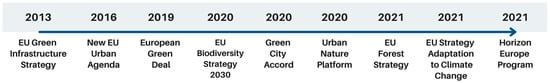 2020EU Biodiversity Strategy 2030Aims to restore biodiversity through NbSs such as ecological corridors, the renaturalization of rivers, and the expansion of urban green spaces.