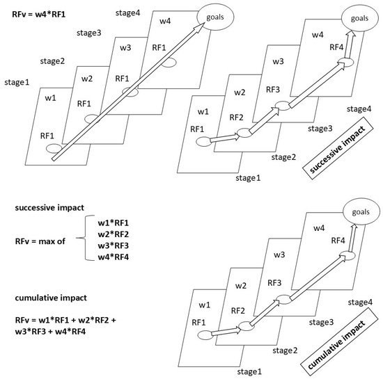 - In the case of cumulative risks, it is logical to posit that the vertical risk factor is the aggregate of the risk factors, as in Equation (5), duly considering the weight assigned to each stage during the risk factor computation.