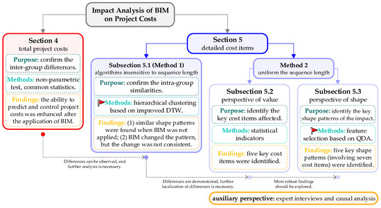 - In Section 5.2 and Section 5.3, the sequence lengths were unified for further analysis. Section 5.2 designed comparative analysis indicators based on common statistics and identified the key cost items affected in terms of value. This process was simple and effective, but the robustness of the findings was difficult to ensure. Section 5.3 continued the analysis from the perspective of shape. A feature selection algorithm based on QDA was designed to learn a subset with excellent classification performance from hundreds of shape features. The subset of shape features was considered to be the key shape pattern of the impact of BIM. This process led to robust findings, but they are less interpretable. Expert interviews and causal analysis could provide an auxiliary perspective to explain the findings to some extent.