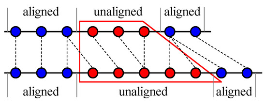 where corresponds to an insertion, corresponds to a deletion, and corresponds to a match.