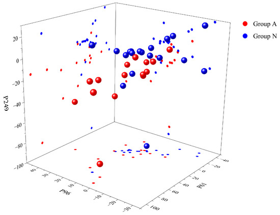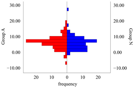 The conclusions drawn from the common statistics shown in Table 4 are consistent with the above conclusions. The mean, standard deviation, and median of the two groups are approximately equal; the skewness of group A is approximately 0, which implies that group N has a more pronounced left-skewed distribution than group A; the kurtosis of group N is approximately 0, which implies that the distribution of group N is approximately normal, while the distribution of group A is more concentrated; the interquartile range (IQR) of group A is less than that of group B, which also implies that the distribution of group A is more concentrated.