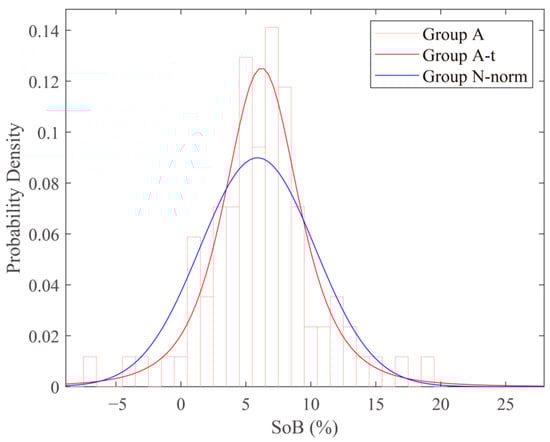 Considering the decisions in Table 3, the distribution of TPC-CV% of group A was fitted using a t location-scale distribution, and the distribution of TPC-CV% of group N was fitted using a normal distribution. The fitting results are shown in Figure 4, and the goodness of fit is fairly good. By comparing the probability density curves of the two groups, it can be seen that the curve of group A is steeper, which indicates that the distribution of TPC-CV% of group A is more concentrated.