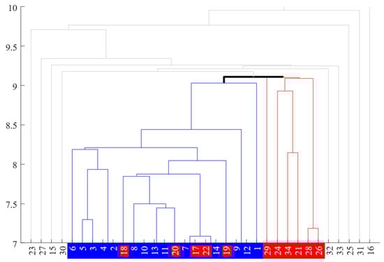 According to the first method, the hierarchical clustering algorithm based on improved DTW, which has been introduced in Section 3.2.1, was adopted to measure the similarities and differences between sequences. Based on the improved DTW distance, hierarchical clustering was performed on the 34 sequences. By observing the process of hierarchical clustering and judging whether the two groups of projects are correctly distinguished, the intra-group similarities and inter-group differences of CI-CV% can be identified. The hierarchical clustering process is shown in Figure 5.